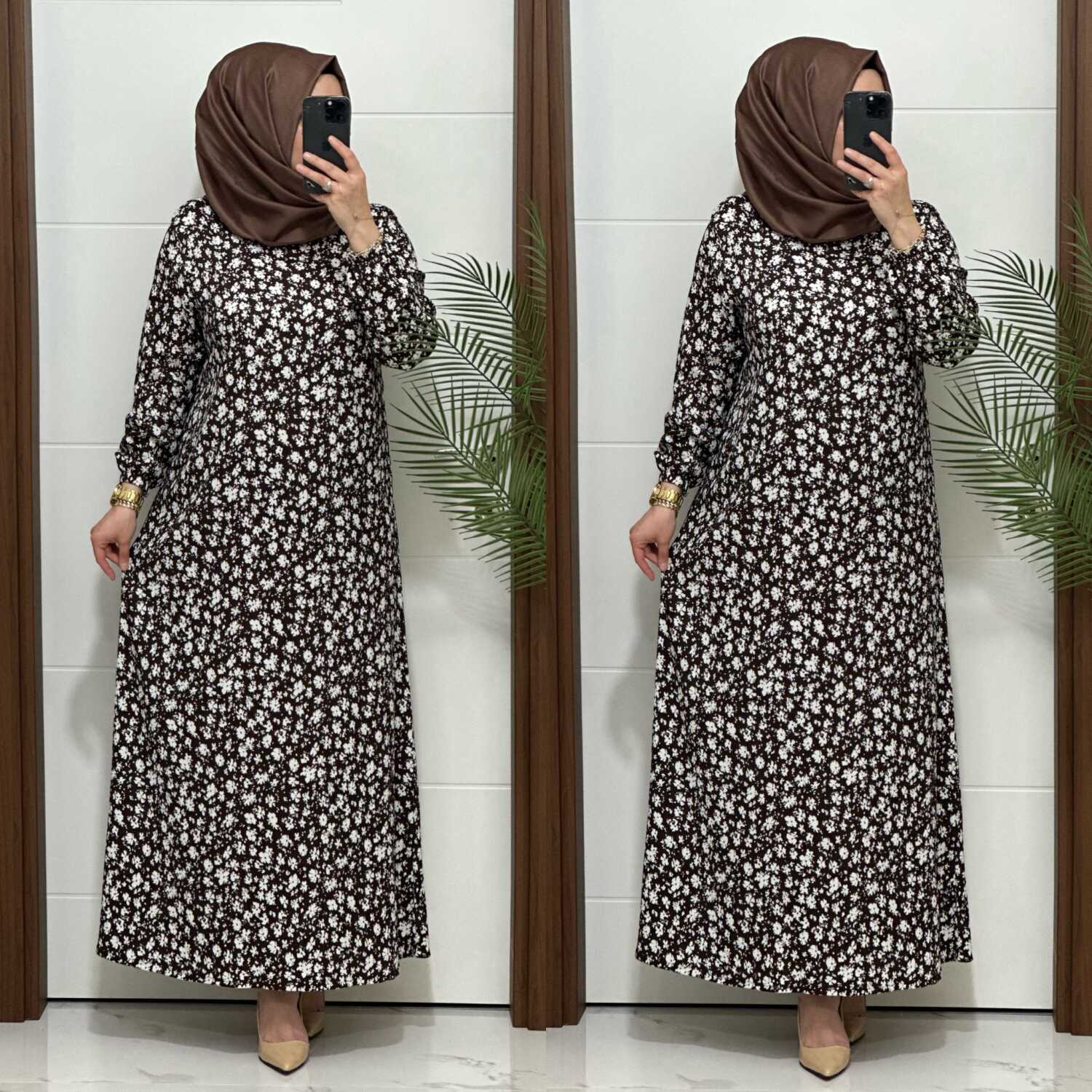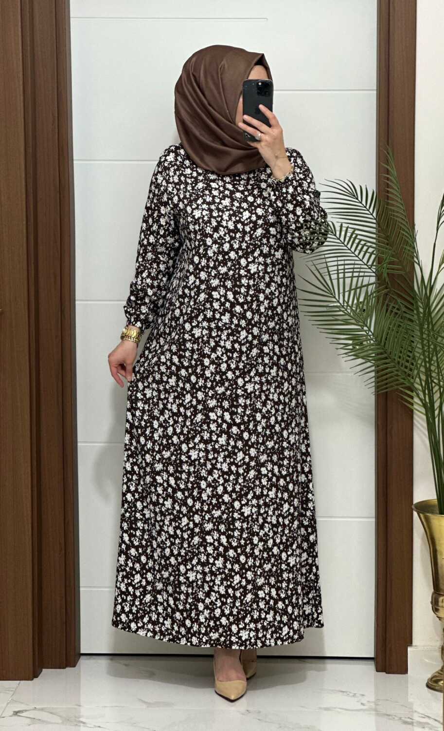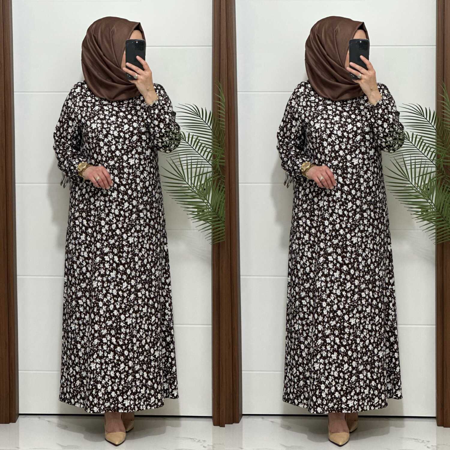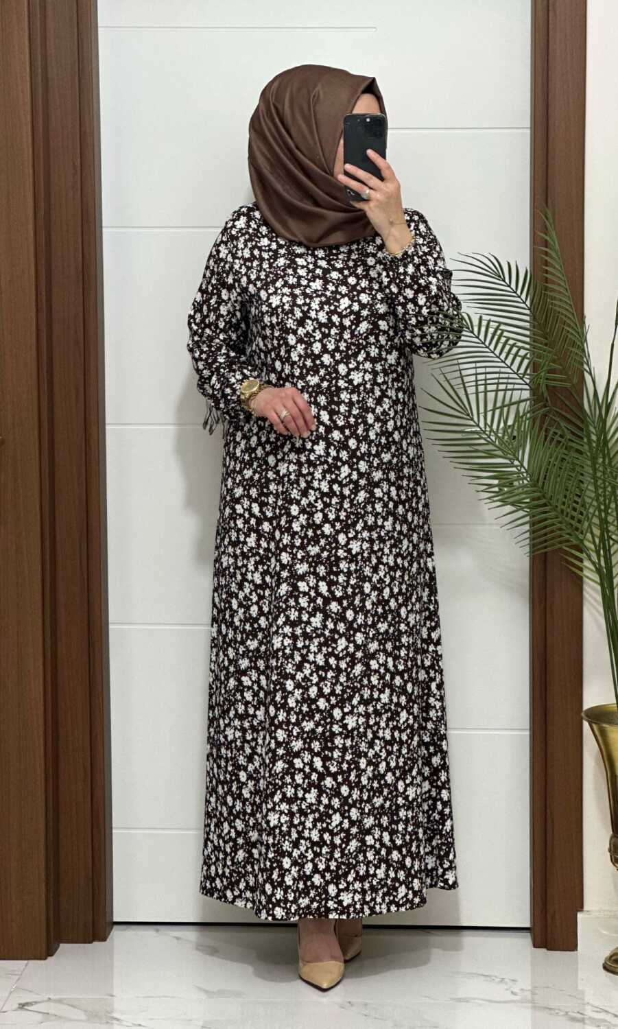 6315 K 80 KAHVE ÇİÇEK DESEN BÜRÜMCÜK ELBİSE